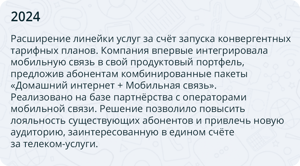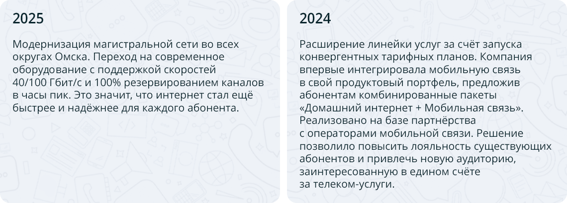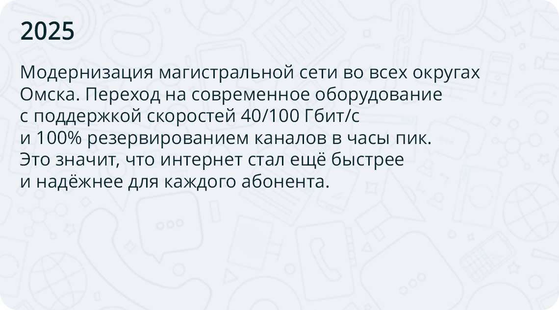 Мы команда профессионалов, развивающая телеком-инфраструктуру родного города. Мы строим и модернизируем оптоволоконные сети, подключаем микрорайоны и социальные учреждения. Наша цель — расширение цифровых сервисов и повышение качества обслуживания омичей через внедрение современных технологий.